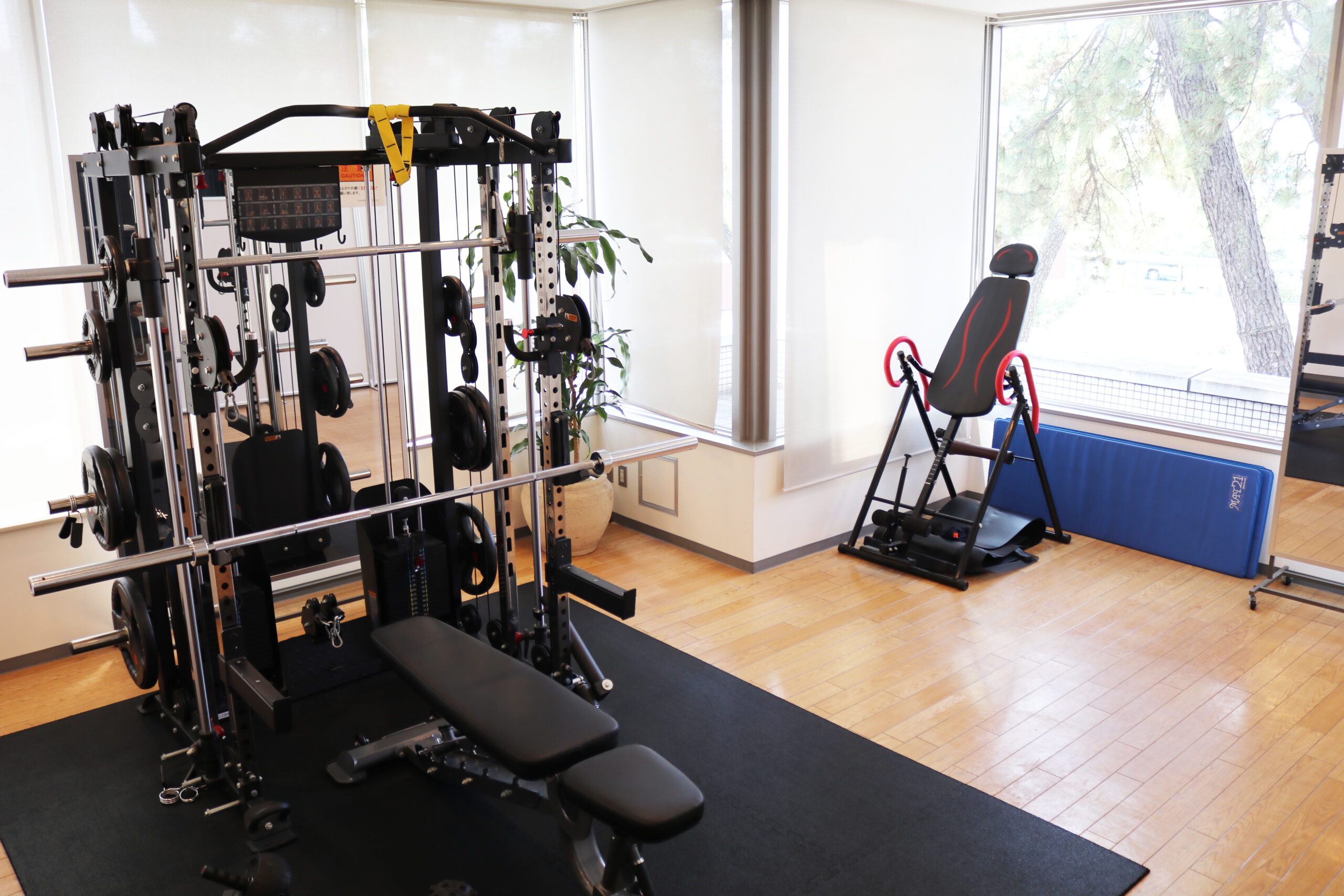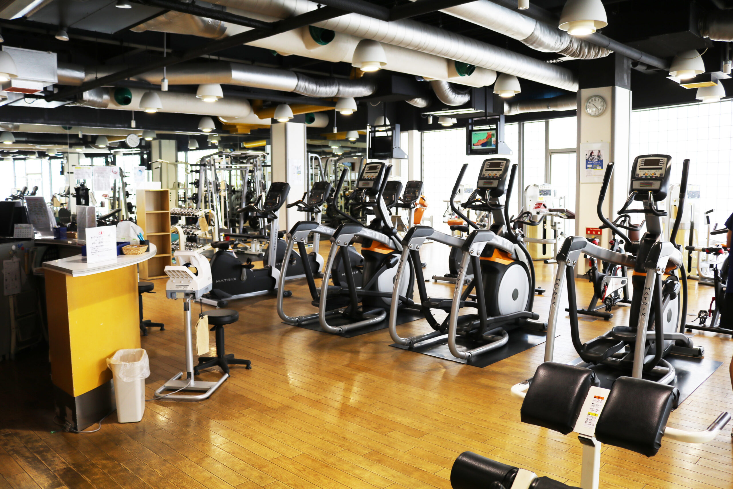 ダンベルにバーベル、マシンの種類も豊富なジムエリアや、ランニングマシン専用エリア。