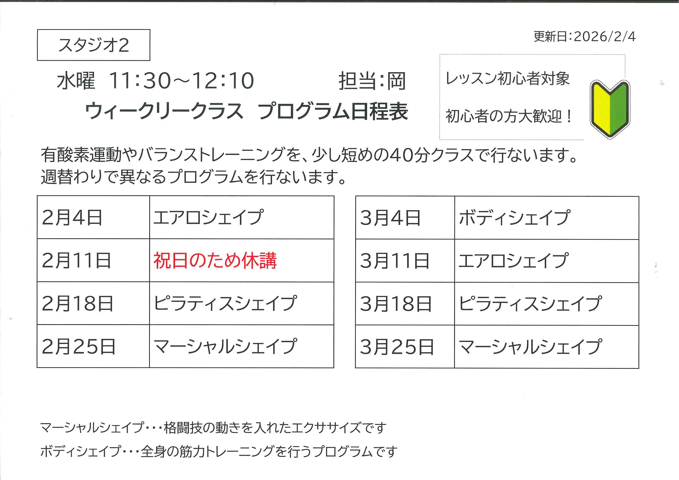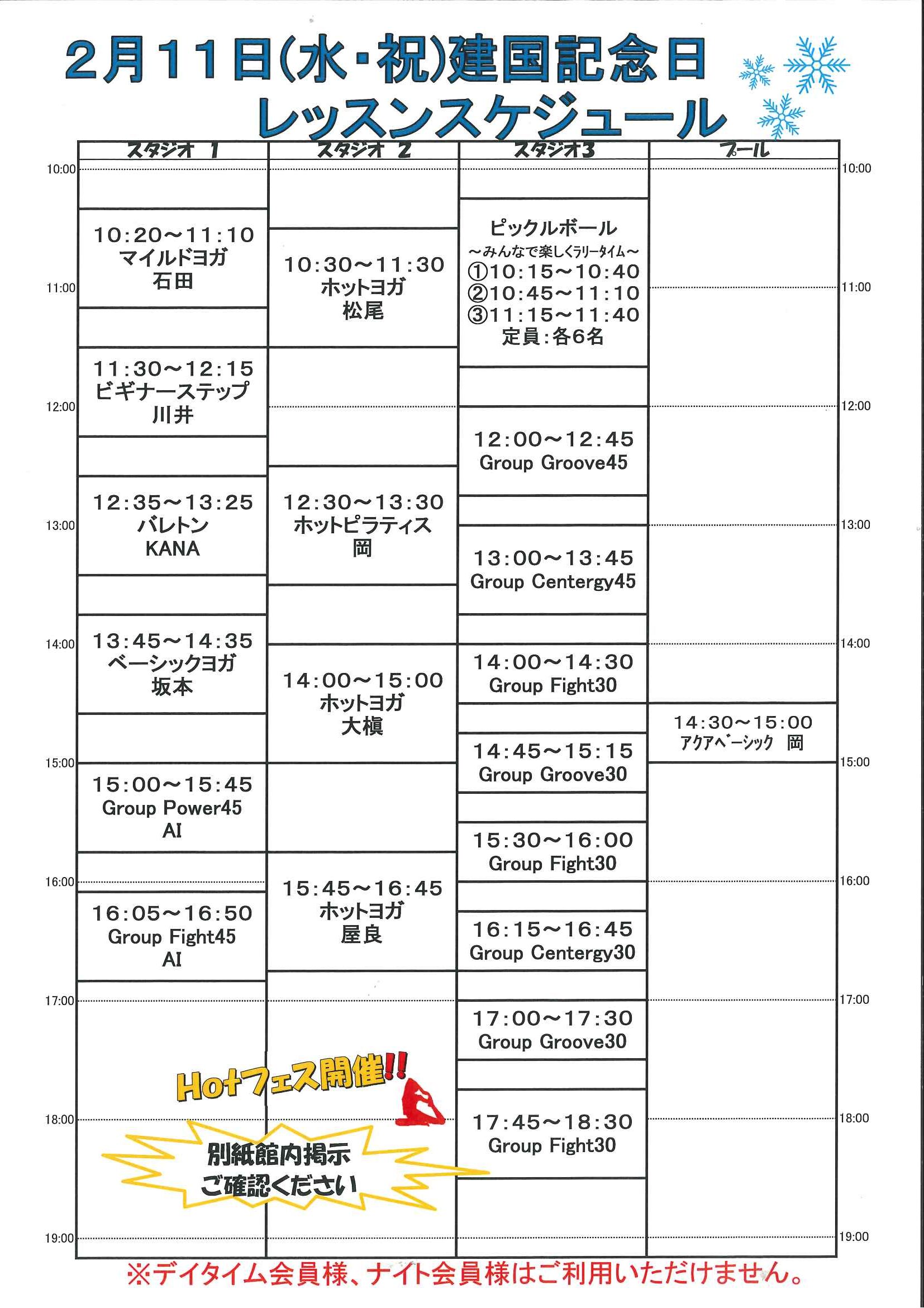 2月11日(水・祝)レッスンスケジュール