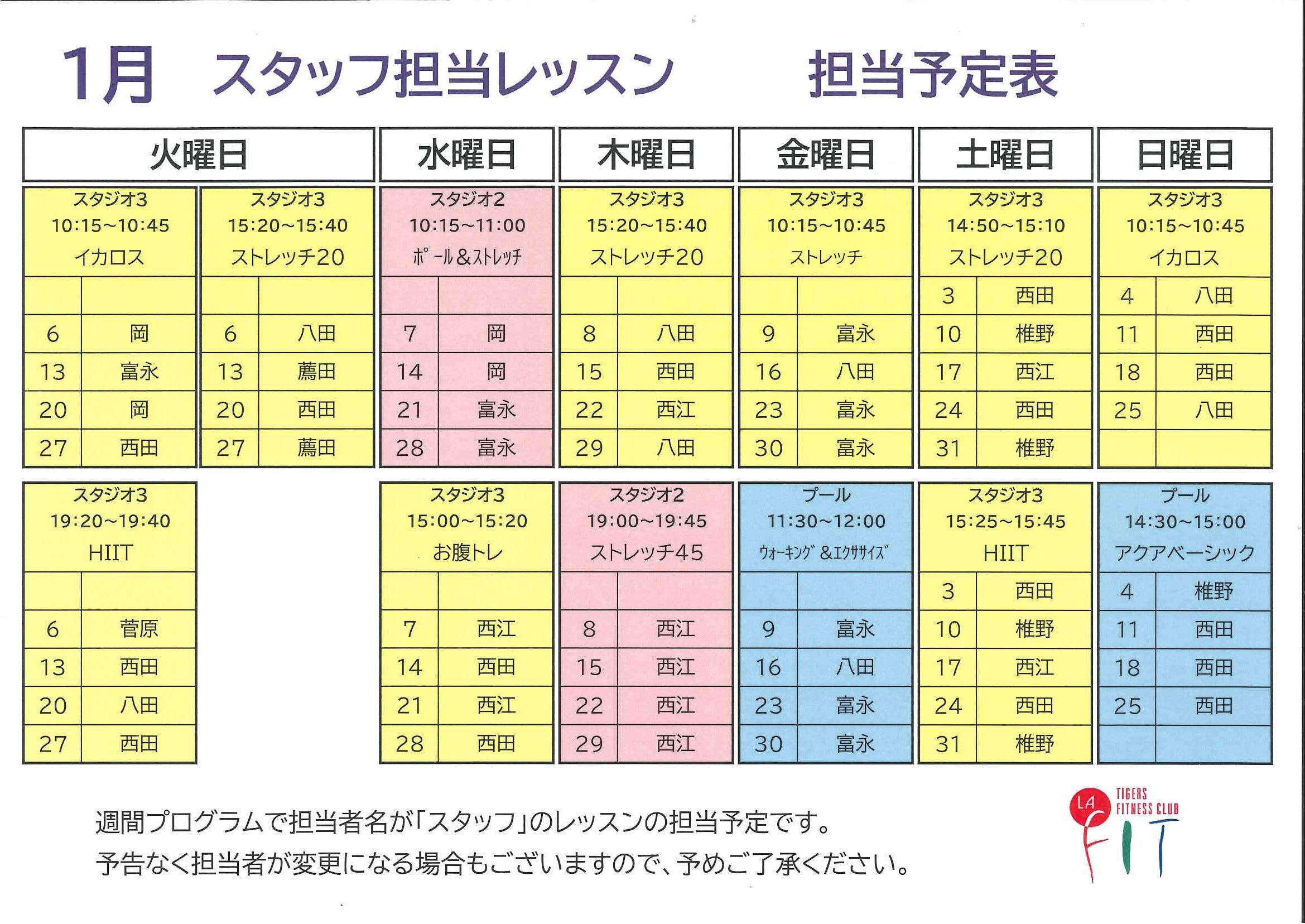 1月 スタッフ担当レッスン予定表