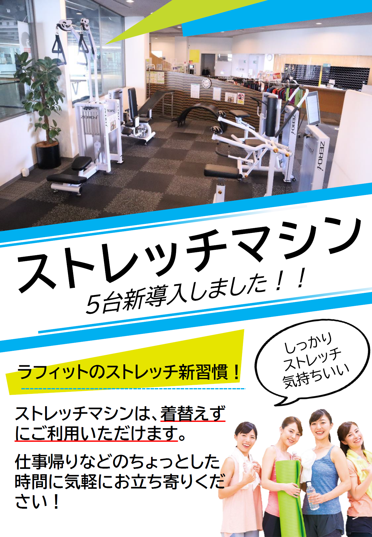 ストレッチマシンは着替えずにご利用いただけますので、お仕事帰りなどのちょっとした時間に、お気軽にお立ち寄りください!