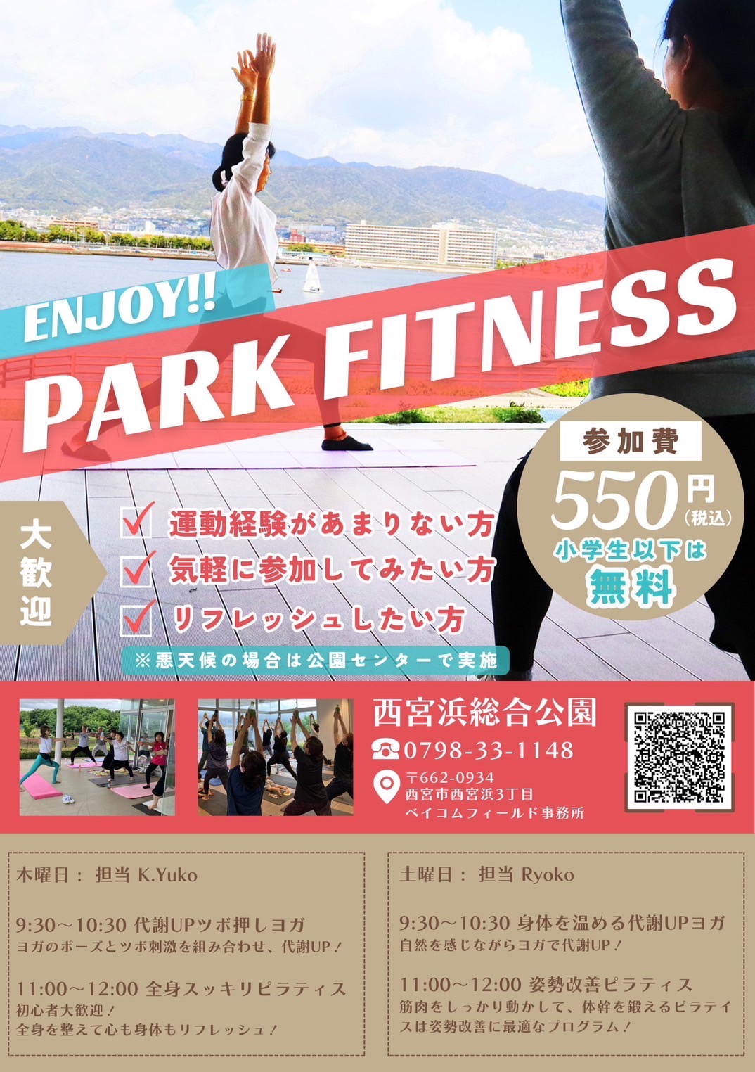 西宮浜総合公園では毎週木曜日と土曜日にヨガとピラティスのレッスンを実施中です。